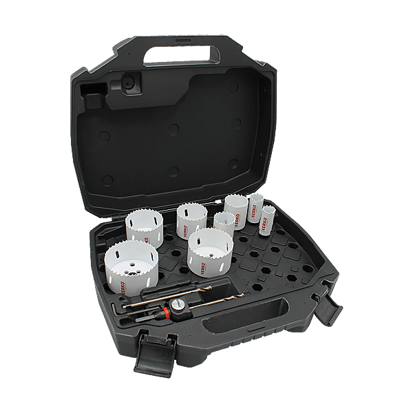 | Composition | - 8 trépans Ø 22, 25, 35, 41, 51, 60 , 68 et 76 mm - 1 arbre EZC - 1 foret HSS Cobalt EZC - 1 clé hexa |