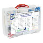 | Composition | - 1 coussin hémostatique - 1 masque bouche à bouche - 1 couverture de survie - 1 écharpe triangulaire - 2 sacs plastiques - 20 pansements adhésifs 20 x 72 mm - 10 pansements adhésifs 53 x 70 mm - 5 pansements adhésifs 10 x 6 cm - 2 pansements compressifs stériles - 10 compresses stériles individuelles 20 x 20 cm - 2 sachets de 5 compresses stériles 7,5 x 7,5 cm - 3 bandes extensibles individuelles 3 m x 5 cm - 3 bandes extensibles individuelles 3 m x 7 cm - 2 bandes extensibles de 3 m x 10 cm - 1 bande de crêpe individuelle 4 m x 5 cm - 1 rouleau de sparadrap sécable de 5 m x 2 cm - 1 paire de ciseaux à bouts ronds de 13 cm - 1 pince à échardes à mors plats - 5 paires de gants jetables - 1 lot de 12 épingles de sûreté - 1 pulvérisateur de 50 ml de solution nettoyante à la chlorhexidine - 1 pulvérisateur de 50 ml de solution anti coups au calendula - 10 compresses d’alcool à 70° - 10 compresses de lotion asséchante - 10 compresses anti coups au calendula - 6 sachets de crème réparatrice petites brûlures, petites gerçures - 6 sachets de gel décontaminant mains sans eau - 5 dosettes de sérum physiologique stérile - 5 œillères operculées - 1 flacon de 100 ml de solution oculaire stérile - 2 lots de 2 mèches hémostatiques stériles Coalgan - 1 livret premiers soins en 10 langues |