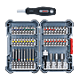| Composition | - 4 embouts Philips en 25 mm: PH1 - 2 x PH2 - PH3 / 1 embout en 65 mm : PH2; - 4 embouts Pozidriv en 25 mm : PZ1 - 2 x PZ2 - PZ3 / 1 embout en 65 mm : PZ2; - 8 embouts Torx en 25 mm : T10 - T15 - 2 x T20 - T25 - T27 - T30 - T40 / 3 embouts en 65 mm : T15 - T20 - T25; - 8 embouts Torx percé en 25 mm : TH10 - TH15 - 2 x TH20 - TH25 -TH27 - TH30 - TH40; - 4 embouts 6 Pans en 25 mm: H3 - H4 - H5 - H6 / 2 embouts en 65 mm : H3 - H4; - 4 embouts Plat en 25 mm : SL3 - SL4 - SL5 - SL6 / 1 embout en 65 mm : SL6; - 3 douilles avec aimant permanent Hexagonal : 6 - 8 - 10 mm; - 1 porte-embout universel; + 1 tournevis manuel porte-embout. |