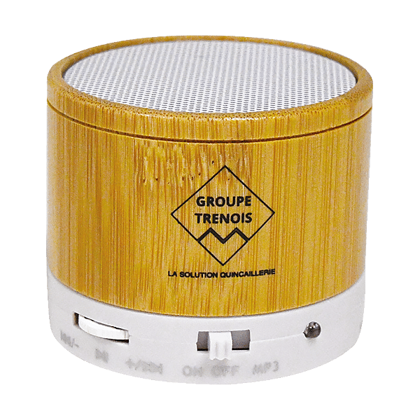 | Désignation | Haut-parleur compact avec corps en bambou et connexion Bluetooth®. Calandre métallique, avec puissance 3W, fonction mains libres, une mini fente de carte SD, fonction radio FM, et la base antidérapante. Rechargeable via câble USB inclus |