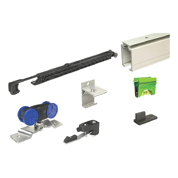 | Composition | - 1 rail 13312/300 - 7 équerres fixation murale 13013 - 2 montures 13232 - 1 butées 11213 - 1 ferme porte M68S - 2 platines fixation sur chant 13036 - 1 guide 1103R - 1 Buly - vis de pose - Notice de pose |