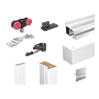 | Composition | • 1 rail aluminium brut percé en longueur de 1,85 m; • 1 tapée en MDF revêtue blanc avec joint blanc; • 2 champlats en MDF revêtus blanc; • 1 bandeau en MDF revêtu (recoupable); • 3 supports de fixation du bandeau; • 2 montures 13218 + 2 platines 13036; • 2 butées d’arrêt réglables 11213; • 1 guide au sol 1103R; • visserie, clé et notice de montage. |