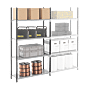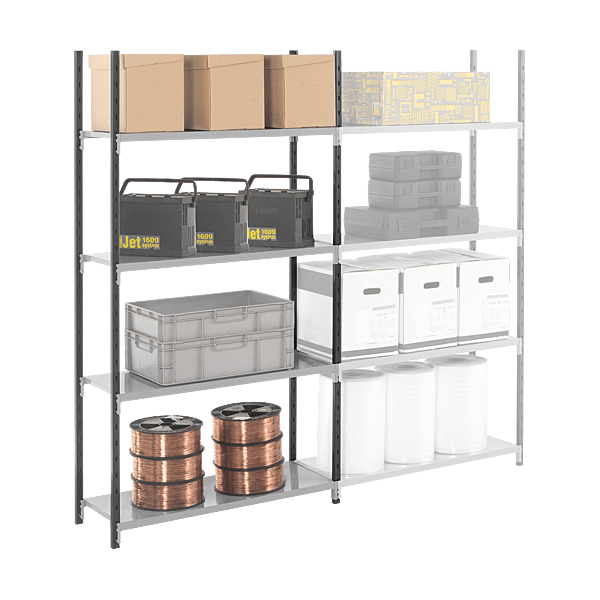 | Descriptif | Poteaux : profil en C, 40 x 20 x 10 x 1,5 mm. Perforations en façade au pas de 62,5 mm. Tablettes : Tôle pliée et soudée avec 4 connecteurs d'accroches. Charge admissible par niveau de 120 kg. Pieds : Plastique permet de protéger et stabiliser le rayonnage. |