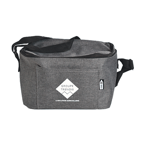 Sac isotherme 2 tons en RPET 600D avec poche frontale. Matériau isolant : PEVA 0,15 mm PEVA + 3 mm de mousse.